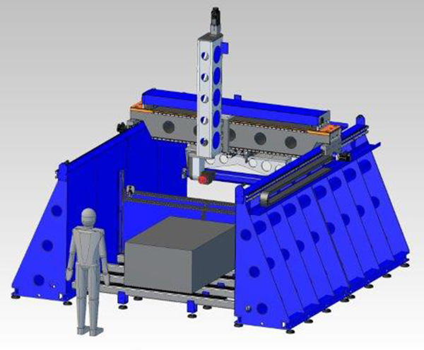 - Bei dieser Konstruktion sind die CNC Achsen aufgeteilt worden. Die X-Achse und Z-Achse befinden sich im Portal. Dank des feststehenden hohen Unterbaus als Y- Achse verfährt jetzt nur das Portal über den Maschinentisch. Das hat den Vorteil, dass nicht so große Massen bewegt werden müssen und die Maschine dadurch extrem dynamisch ist.